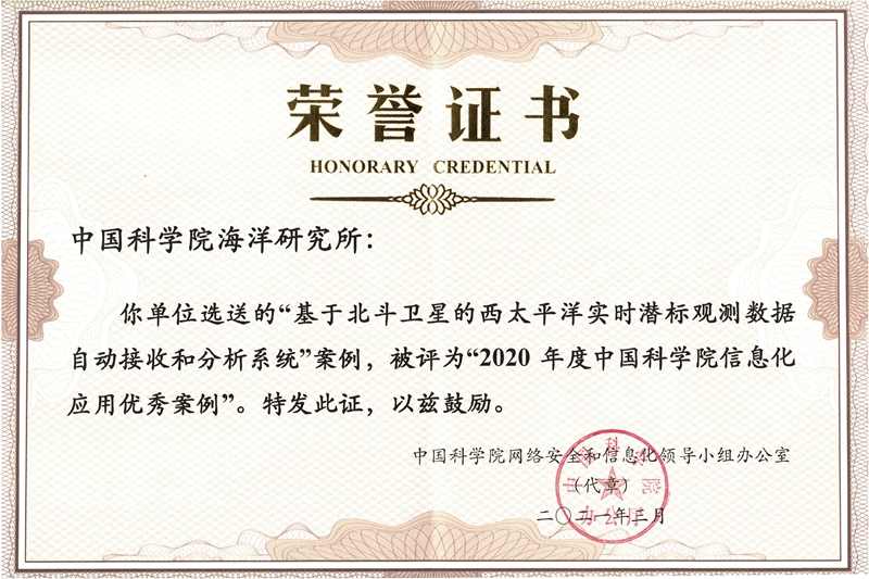 近日,中国科学院公布了“2020年度中国科学院信息化十大优秀案例”,海洋所王凡团队自主建设完成的“基于北斗卫星的西太平洋实时潜标观测数据自动接收和分析系统”成功入选。