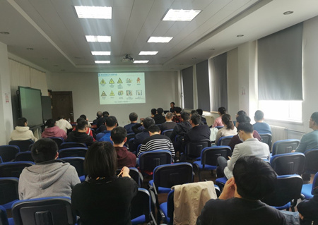 在安全培训中,董佳结合现场检查情况,从?;饭芾怼⑽O帐笛楣芾?、设备管理、个人防护、国家安全、交通安全等方面,通过安全管理知识讲解、事故图片展示、以及近两年部分有代表性的安全事故案例分析,介绍了安全管理经验,强调了日常注意事项。培训过程中,参会人员还就实验室日常安全管理工作进行了交流讨论。