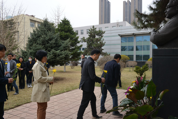 青年科研人员向李薰先生塑像敬献菊花