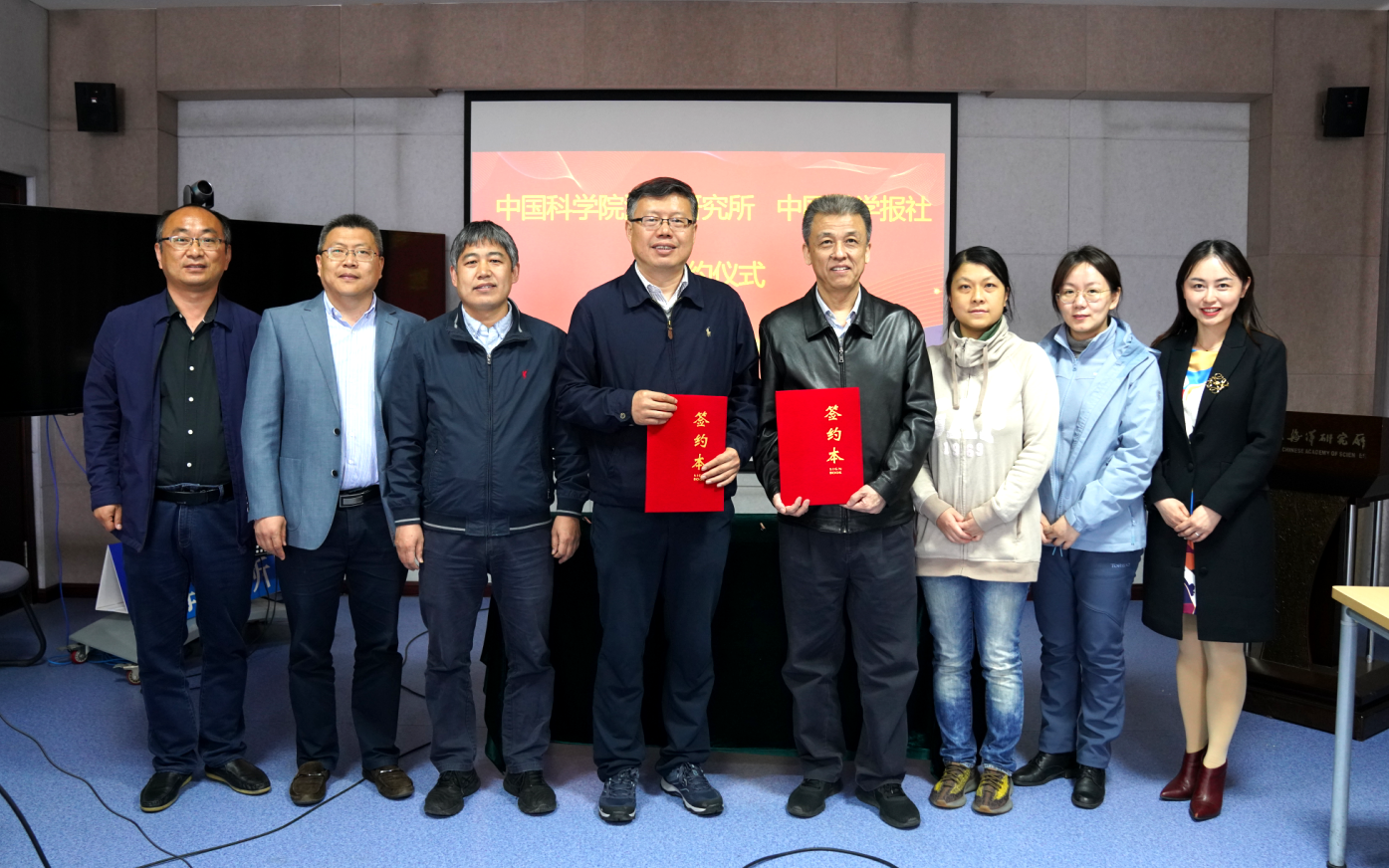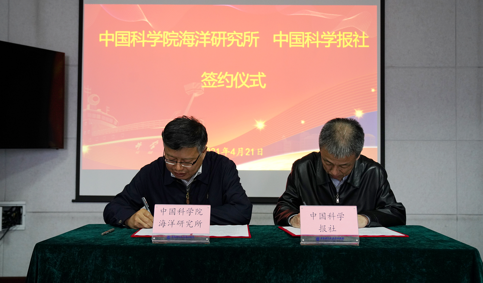 4月21日,中国科学报社山东记者站共建协议签约仪式在海洋所举行,海洋所党委书记王辉与中国科学报社党委书记刘峰松代表双方签署协议。双方综合处、人事处相关负责同志参加座谈。根据协议,中国科学报社山东记者站将依托海洋所具体开展相关工作,并将全力支持研究所的科学传播工作。