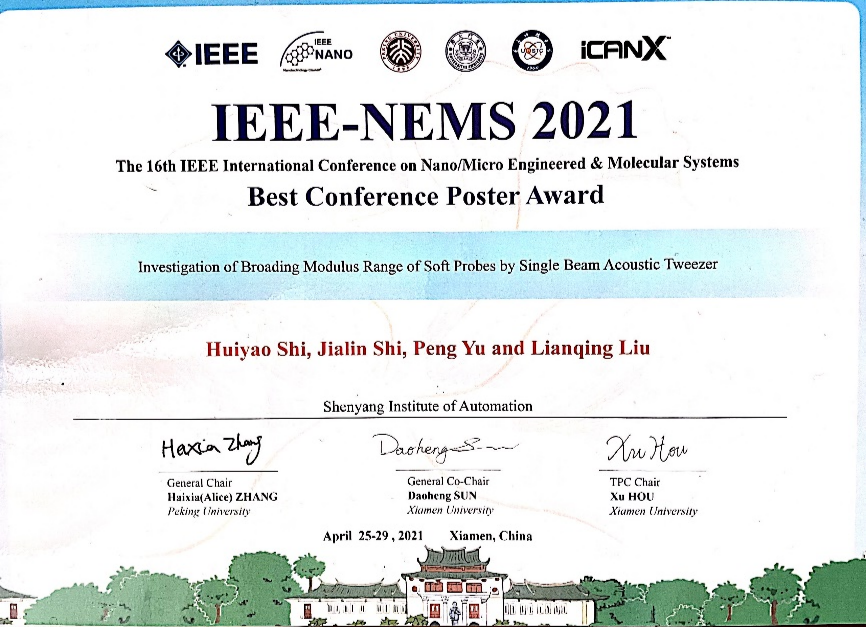 近日,第16届微纳工程与分子系统国际研讨会(the 16th IEEE International Conference on Nano/Micro Engineered & Molecular Systems:IEEE-NEMS2021)国际会议在厦门举行。中国科学院沈阳自动化研究所博士生石慧瑶等撰写的论文Investigation of Broading Modulus Range of Soft Probes by Single Beam Acoustic Tweezer脱颖而出,获得最佳会议海报奖。