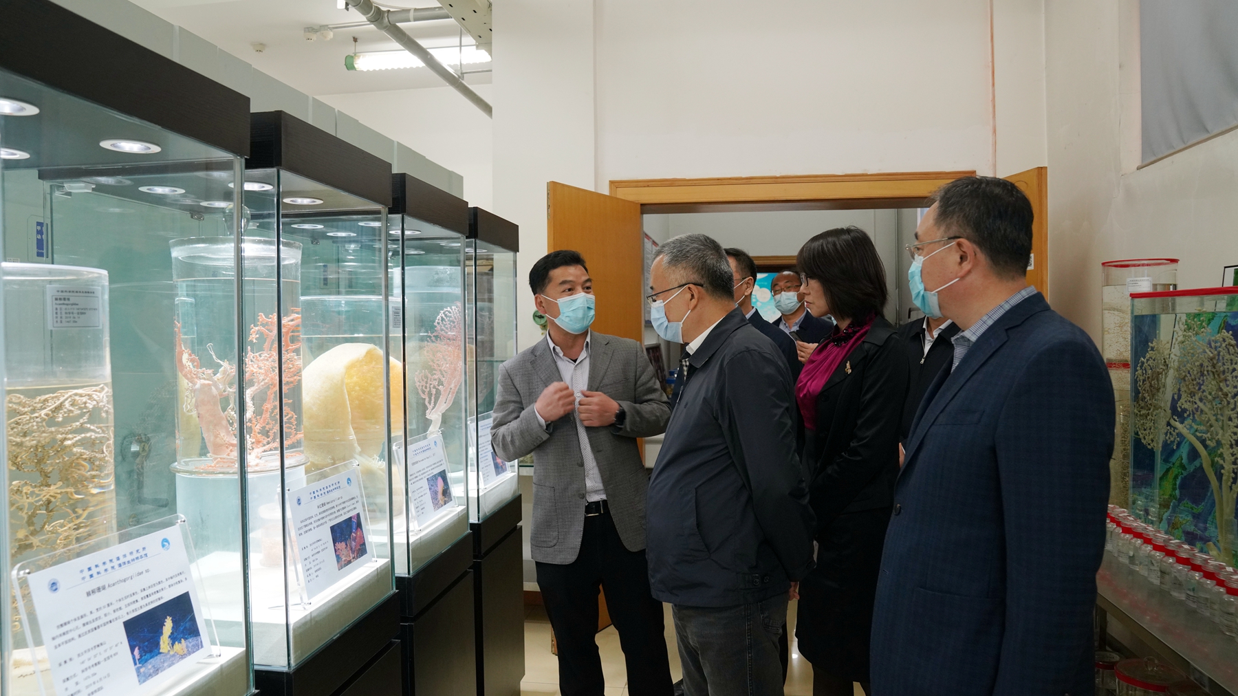 在中科院海洋生物标本馆深海样品库,孟庆海副主席听取了海洋所在深远海科考能力建设、深海原位探测研究方面的成果汇报,实地考察了获取的深海大型生物、岩石样品及图像、视频资料。
