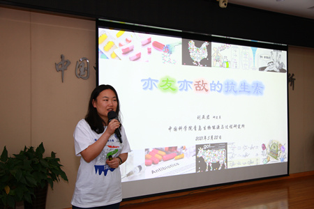 在“好看的舞台剧”环节,所内职工、研究生精心准备了《科学家屠呦呦》的舞台剧,通过演绎优秀科学家故事,传播科学理念,弘扬科学家精神,号召青少年向优秀科学家学习,成为一名有担当、有责任、有理想、有志气的中国好少年。在“涨知识的科普讲座”环节,我所刘亚君研究员以 “亦友亦敌的抗生素”为题,向青少年讲解什么是抗生素、抗生素是如何发现的以及抗生素是怎么样?;の颐堑?。报告应用大量实例、视频动画展示并紧密结合日常生活,受到学生的热烈欢迎,学生们积极互动,现场气氛活跃。