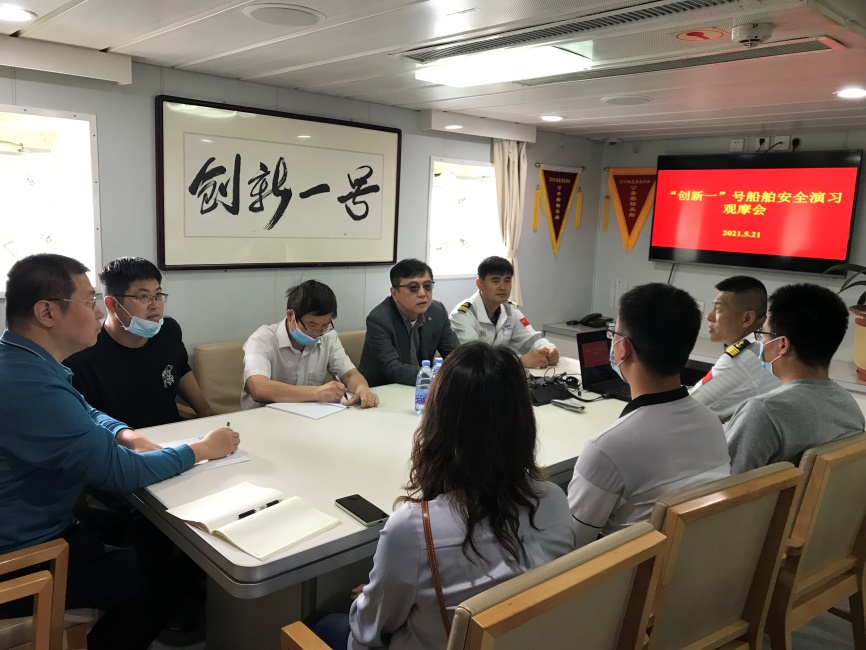 船长王述强汇报了船舶的安全管理工作特点、要求和“创新一”号科考船安全工作开展情况。