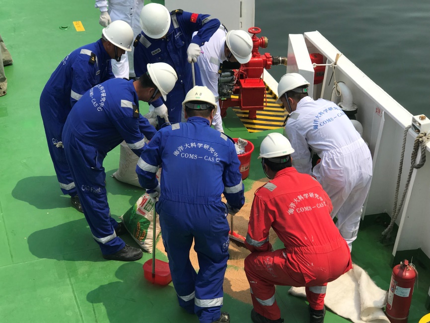 随后,针对模拟物料间着火、弃船救生、溢油等三个情景进行安全演习。在演习中,全体船员组织有序、积极配合,演练了消防灭火、救生安全设施的正确操作,溢油的应急处理等。