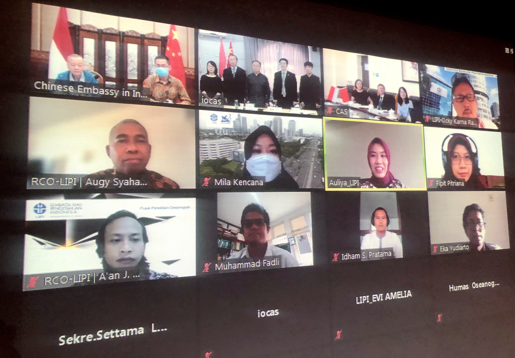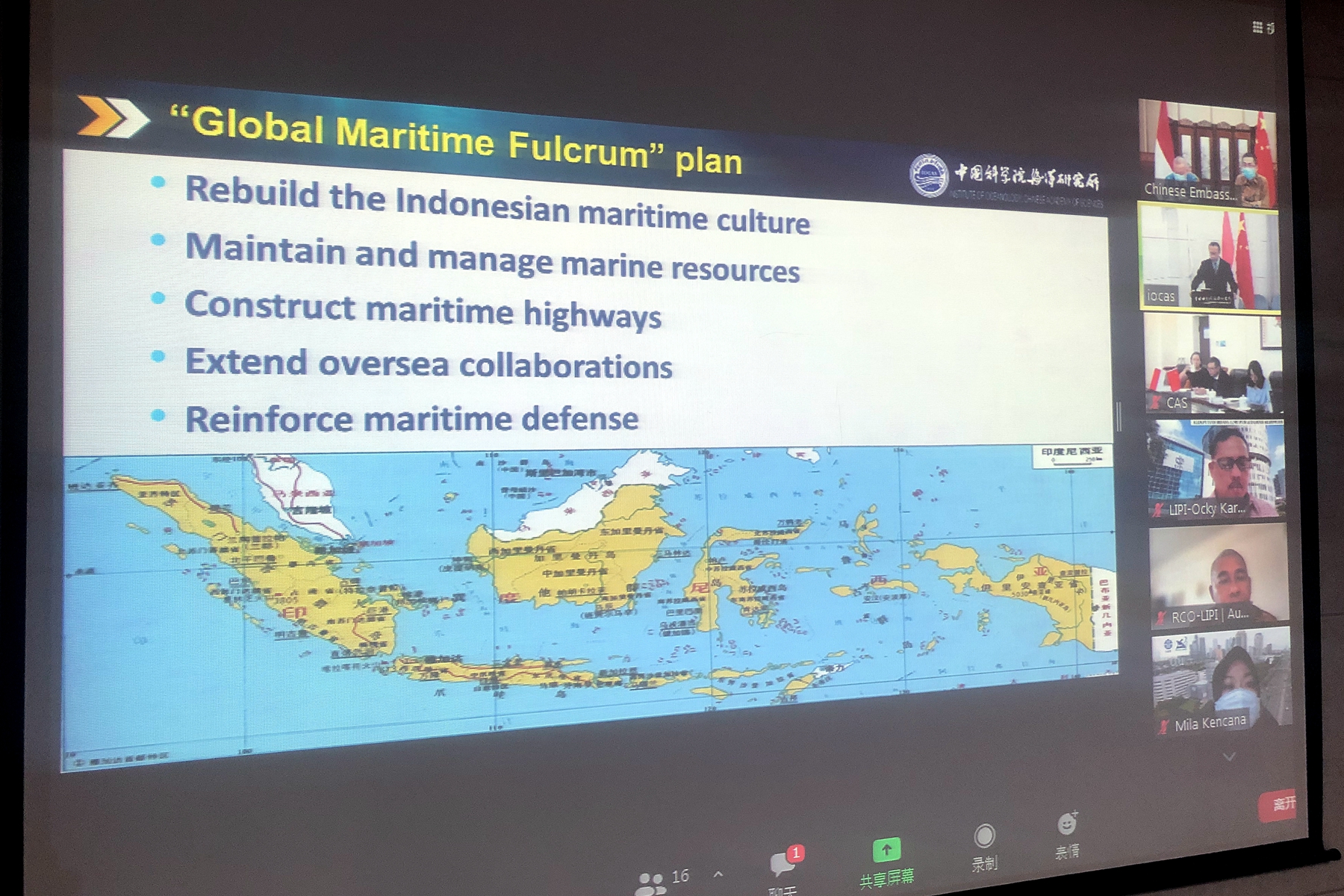 中国驻印尼使馆科技参赞易凡平、印尼科学院副院长Ocky Karna Radjasa及中科院国际合作局副局长王振宇出席会议并见证《意向书》签署。中国驻印尼使馆、中科院国际合作局、印尼科学院合作、法律及公共关系局、中科院海洋所及印尼科学院海洋研究中心相关人员参加了会议。
