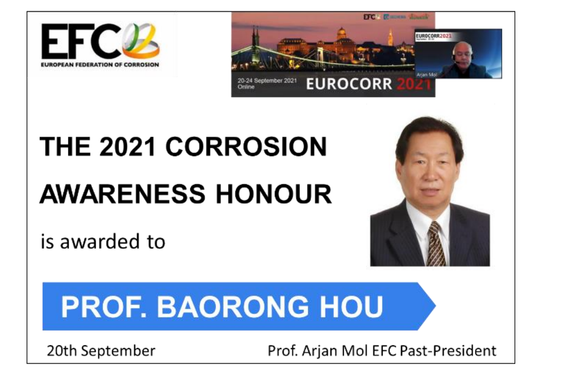 世界“腐蚀成就奖”于2021年首次设立,由世界腐蚀组织发起,与欧洲腐蚀联盟及中国腐蚀与防护学会联合举办,旨在授予具有重大影响力,显著提高了政府、科技界、工业界和公众对腐蚀及防腐重要性的认知,并在腐蚀控制领域做出杰出贡献的科学家。该奖项由世界腐蚀组织、欧洲腐蚀联盟及中国腐蚀与防护学会的委员等组成的国际评审委员会评议,不接受个人申报。经多轮投票和评议,一致推选侯保荣院士为2021年度世界“腐蚀成就奖”唯一获奖者。