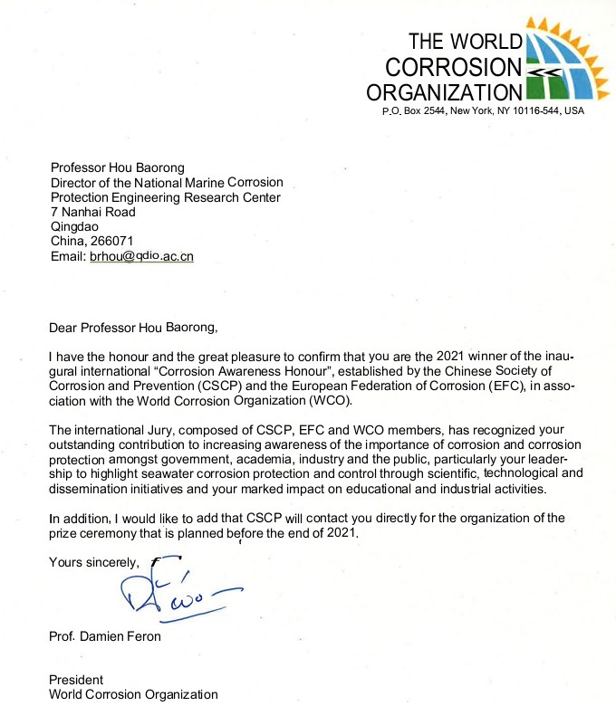 日前,中国科学院海洋研究所研究员、中国工程院院士侯保荣获联合国世界腐蚀组织(WCO)颁发的首届世界腐蚀成就奖。