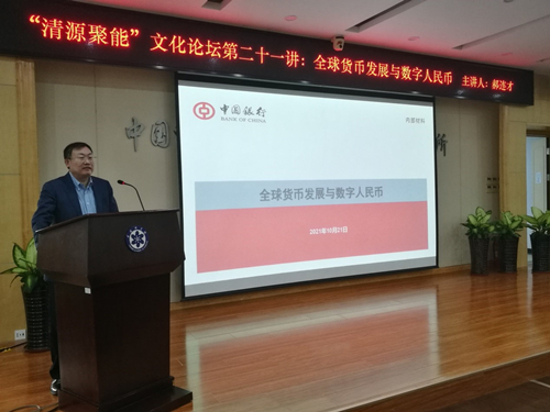 郝连才以“全球货币发展与数字人民币”为题,从全球货币发展简介、全球电子货币及数字货币发展情况和我国数字人民币试点情况及思考三个方面进行了详细的讲解。