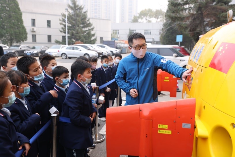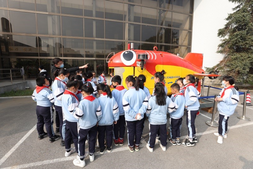 科普报告会结束后,针对小学生特点,活动为同学们精心准备了多款机器人,包括可飞行的仿生扑翼微型机器人,能互动的机械臂,可爬行的“侦察兵”轮履式机器人,还有两款近期海试归来的水下机器人。同学们兴致勃勃的观看了多款功能各异机器人的演示,聆听了研究所科研人员和研究生的讲解,与科学来了一次近距离接触。