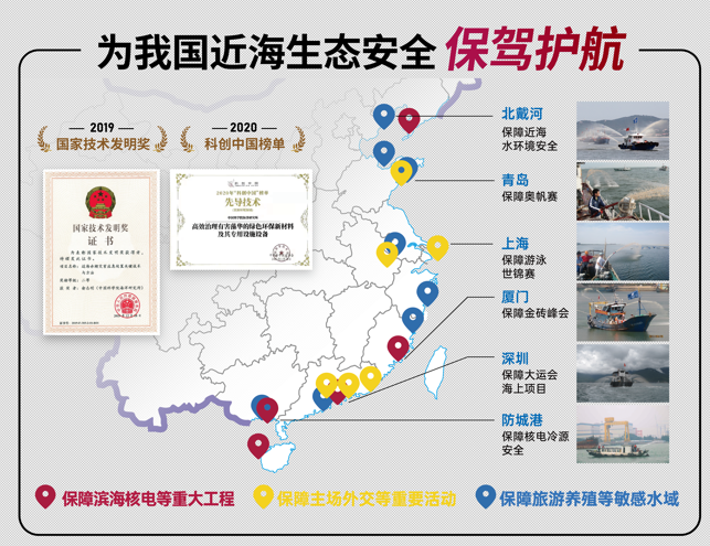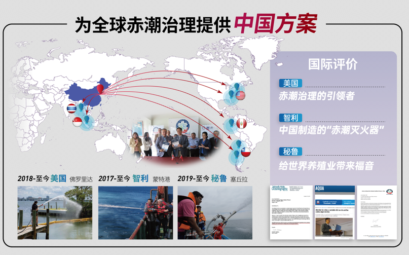 “十三五”期间,该技术通过了国际第三方的效果和安全评估,成功走出国门,助力“一带一路”,在美国、秘鲁、智利、新加坡等国家推广应用,被誉为中国制造的“赤潮灭火器”、“国际赤潮治理的引领者”,为全球赤潮治理提供“中国方案”。2019年该技术获得中国“国家技术发明奖二等奖”,2020年作为中国科协首次评选出的全国50项先导技术之一,列入科创中国榜单。
