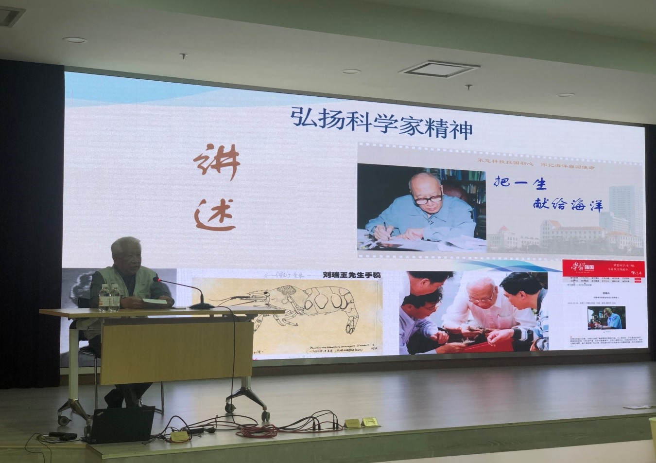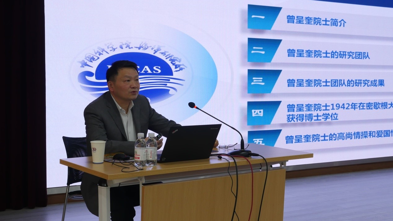 王广策同志作了题为“曾呈奎院士和他的研究团队”的主题报告,重温了“爱国敬业、耕海泽农、前瞻布局、甘为人梯”的曾呈奎科学精神,一起缅怀了曾呈奎院士始终心系人民、报效祖国,无私奉献、奋发进取,以促进祖国发展为己任,全力投身国家海洋科教事业的感人事迹。报告结束时,他指出,“时代轮替中,始终不变的是奋斗者的身姿;历史坐标上,始终清晰的是奋斗者的步伐”??蒲Ъ揖袷侵泄膊橙司衿紫档淖槌刹糠?,承载着党的初心使命,中国梦的内核就是由像曾呈奎先生等这样一代代华夏儿女的奋斗与汗水熔铸而成。大力弘扬科学家精神,就是要深入贯彻落实习近平总书记重要指示批示精神,向以曾呈奎院士为代表的老一辈科学家们学习,以咬定青山不放松的执着奋力实现既定目标,不断推进我国海洋科技事业率先发展。