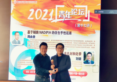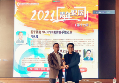12月21日,中国科学院大连化学物理研究所青年创新促进会(以下简称“青促会”)、大连化物所团委、博士后联谊会共同在能源基础楼举办“大连化物所青年论坛”第十七讲。本次论坛邀请了手性合成研究组(201组)组长周永贵研究员和纳米反应器与反应工程学创新特区研究组(05T7组)组长刘健研究员,分别作了题为“基于辅酶NAD(P)H的仿生手性还原”和“纳米多孔材料化学”的精彩报告。大连化物所副所长李先锋出席本次论坛,并为两位报告人颁发“大连化物所青年论坛”特制奖杯。大连化物所内青年职工、博士后、研究生等近100人以线下和线上的方式听取了报告。