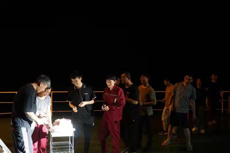 夕阳西下,一道晚霞映射在湛蓝的天空,平静的海面没有一丝波澜,“科学”号的航迹宛如天上掉下来的彩虹,蜿蜒在无边无际的大海之中。微风轻轻吹过脸庞,耳边传来了“科学”号前甲板的欢声笑语。伴随一声汽笛响起,船长孙其军宣布“科学”号2201航次过赤道星光晚会正式开始。厨房准备了丰盛的晚餐,大厨特意为本航次过生日的科考队员们制作了精美的生日蛋糕?!白D闵湛炖郑D闵湛炖帧比宕釉蔽枪渤崭璨⑺蜕险嬷康淖8???瓶级釉背塘饧ざ厮担骸俺ふ饷创?,这是过的最特别、最难忘、最有意义的一次生日,谢谢“科学”号的同事们!”