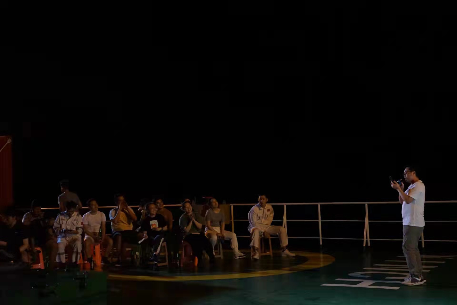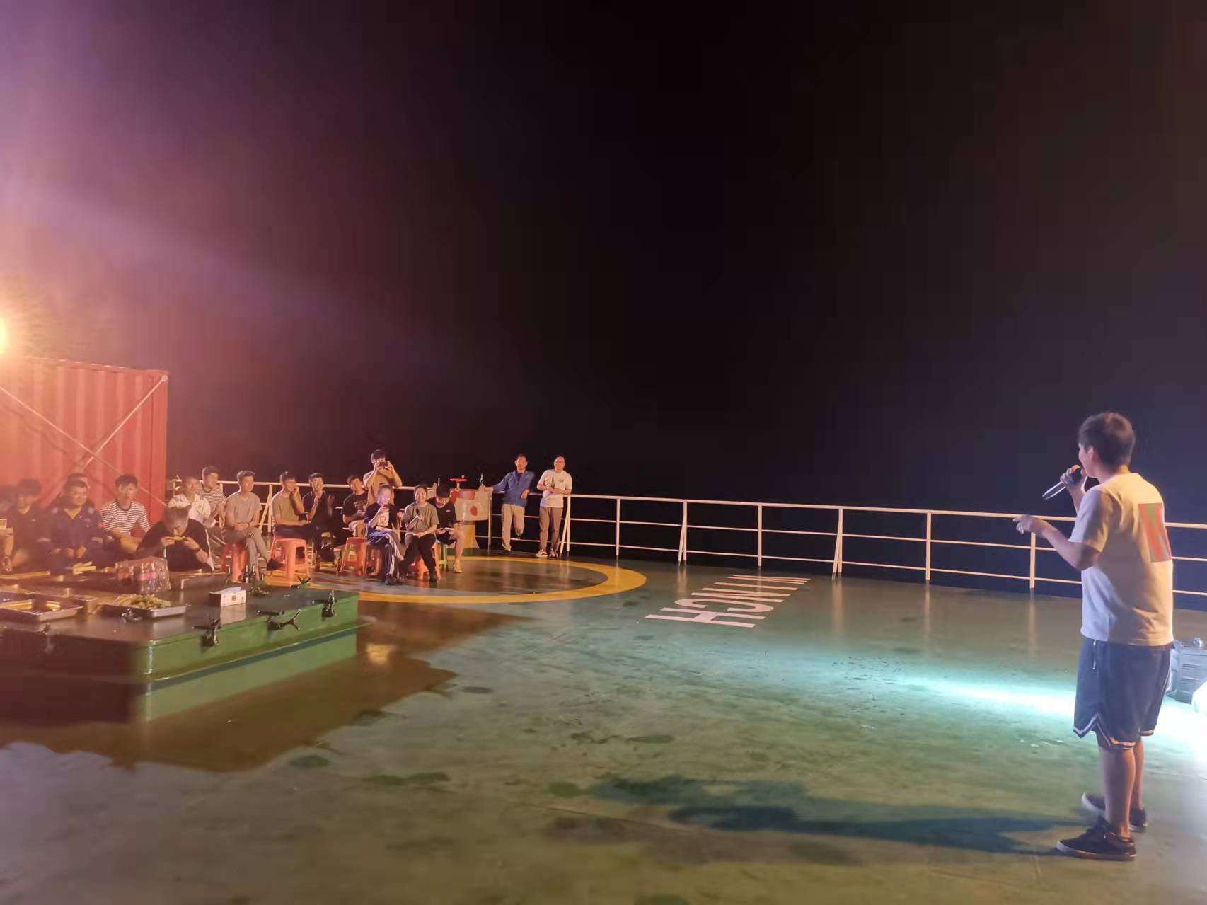 晚会编排了非常精彩的文艺节目,有个人独唱、集体合唱、脱口秀以及幸运抽奖等节目。轮机长孙宗强演唱的《you raise me up》以专业级的唱腔、充满真挚情感的歌声感染了在场的所有人,迎来阵阵掌声。中国地质大学科考队员合唱的《水手》,表达了他们对“科学”号所有船员及工程技术人员的感谢和敬意。来自中国科学院海洋研究所的科考队员共同合唱了《精忠报国》,表达了海洋科研人员热血豪迈的爱国之情和海洋强国的报国之志。首席科学家胡石建对航次所有人员的辛苦付出表示感谢,并拿出自己的出海费作为奖品组织了幸运抽奖环节。