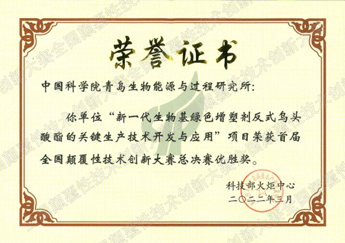 近日,首届全国颠覆性技术创新大赛总决赛在深圳圆满落幕,经过9个月的激烈比拼,青岛能源所申报的“新一代生物基绿色增塑剂反式乌头酸酯的关键生产技术开发与应用”项目经过初筛、领域赛和总决赛等环节层层遴选,从来自全国各地高校、科研院所、创业公司、龙头企业的共计2724个项目中脱颖而出,荣获赛事最高奖项——总决赛优胜奖(共36项),是山东省的两个获奖项目之一,也是中国科学院四个获奖项目之一。