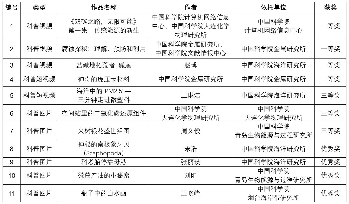 2023年中国科学院科普视频图片大赛沈阳分院系统获奖名单(公开组)