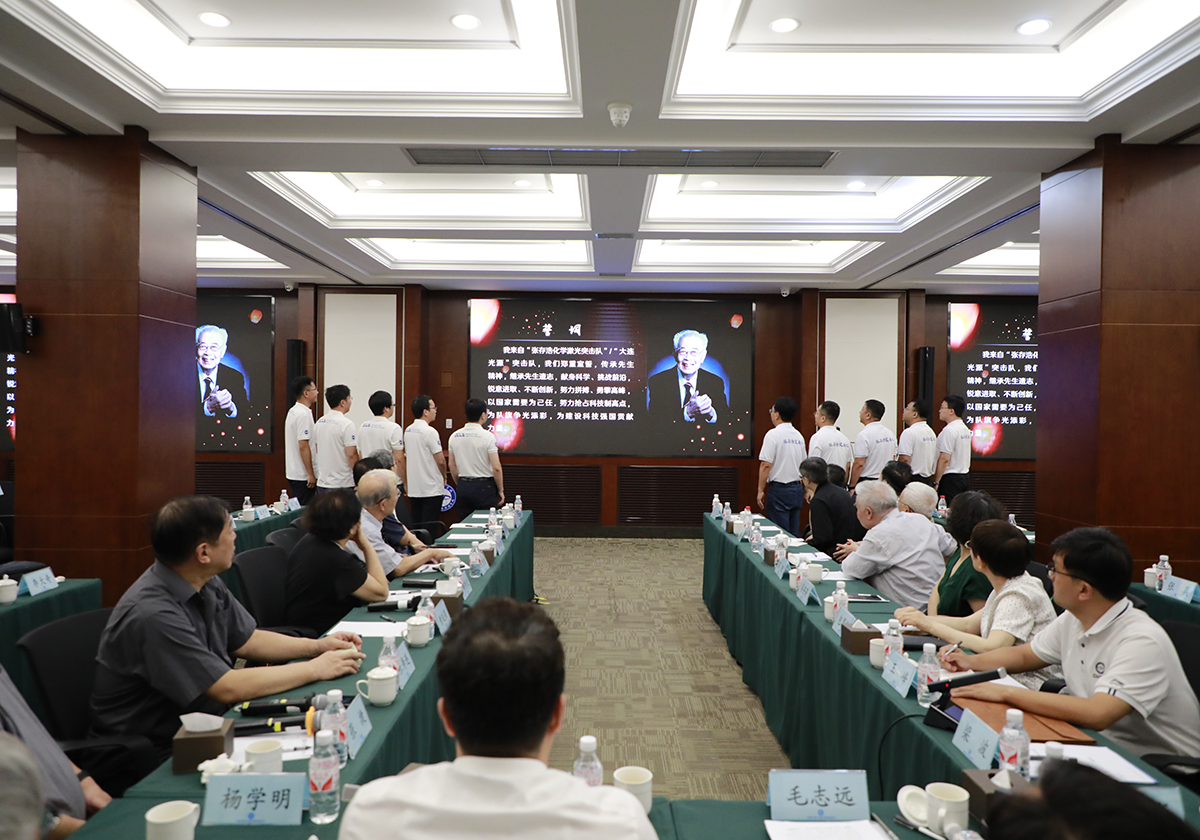 最后,追思会“传承”环节上,大连化物所“张存浩化学激光突击队”和“大连光源突击队”代表现场重温了誓词:“我们郑重宣誓,传承先生精神,继承先生遗志,献身科学、挑战前沿,锐意进取、不断创新,努力拼搏、勇攀高峰,以国家需要为己任,努力抢占科技制高点,为队旗增光添彩,为建设科技强国贡献力量。”誓言铮铮,矢志报国,以张存浩先生精神为引领,为建设科技强国竭尽全力,这是对张存浩精神最好的传承与发扬,也是对先生最好的追思和怀念。