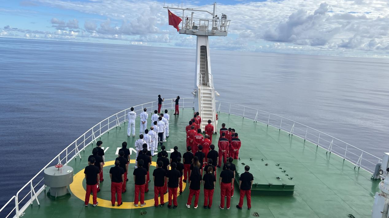 清晨6时,“科学”轮全体船队员身着工作服整齐列队,党员同志佩戴党员徽章,在甲板上组成“76”字样的方阵,致敬新中国成立76周年。当国旗升至杆顶的瞬间,全体船队员庄严宣誓:“以科学之名探索深海,以忠诚之心守护海疆!”这是对祖国的庄严承诺,更是新时代海洋科技工作者的使命宣言。仪式结束后,大家纷纷表示:“每一次设备下潜、每一份样本数据,都是对国家海洋强国战略的具体践行。