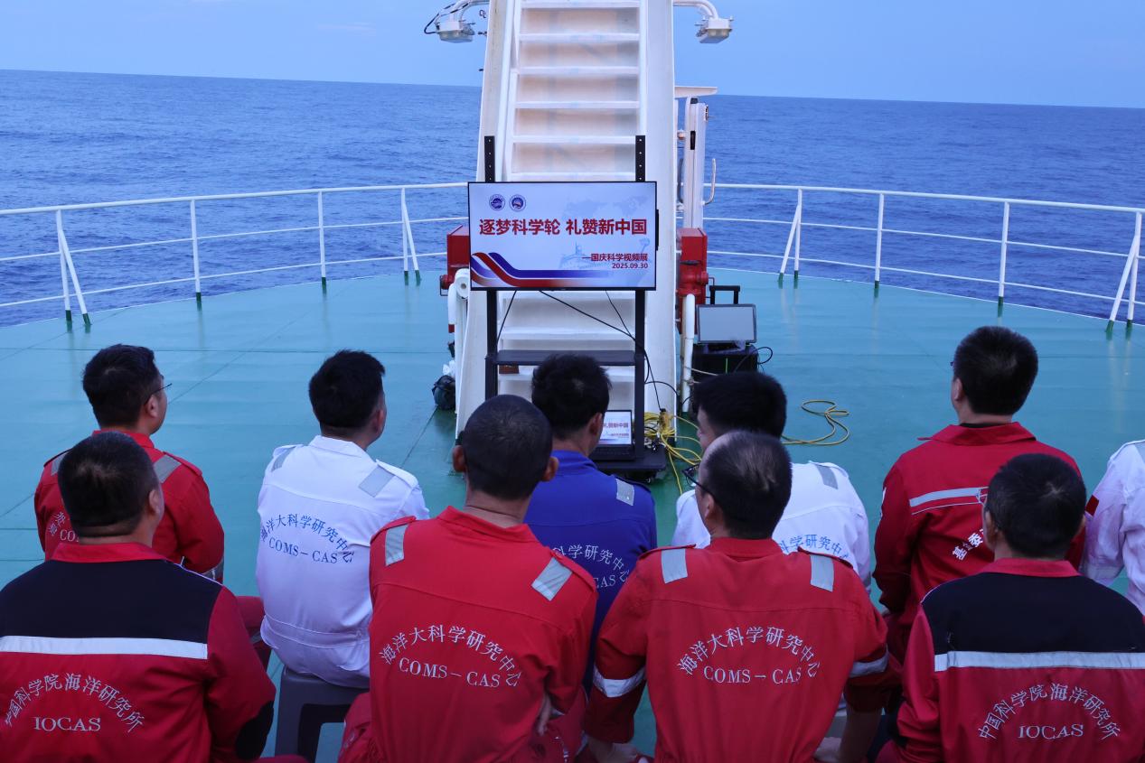 傍晚7时,前甲板的大屏幕亮起,大家席地而坐,观看“科学轮成果巡展视频”。自2014年首航跨赤道布放潜标、2016年发现超临界二氧化碳流体、2018年获取中部型厄尔尼诺全水深数据,2020年在深海冷泉区发现新型硫氧化微生物……一系列标志性成果生动展现了“科学”号在探索海洋科学道路上的坚实步伐。夜幕降临,甲板上国旗迎风飘扬,白天写下的祝福仍在心间回荡,与视频余韵交织成一曲深情的海上礼赞。